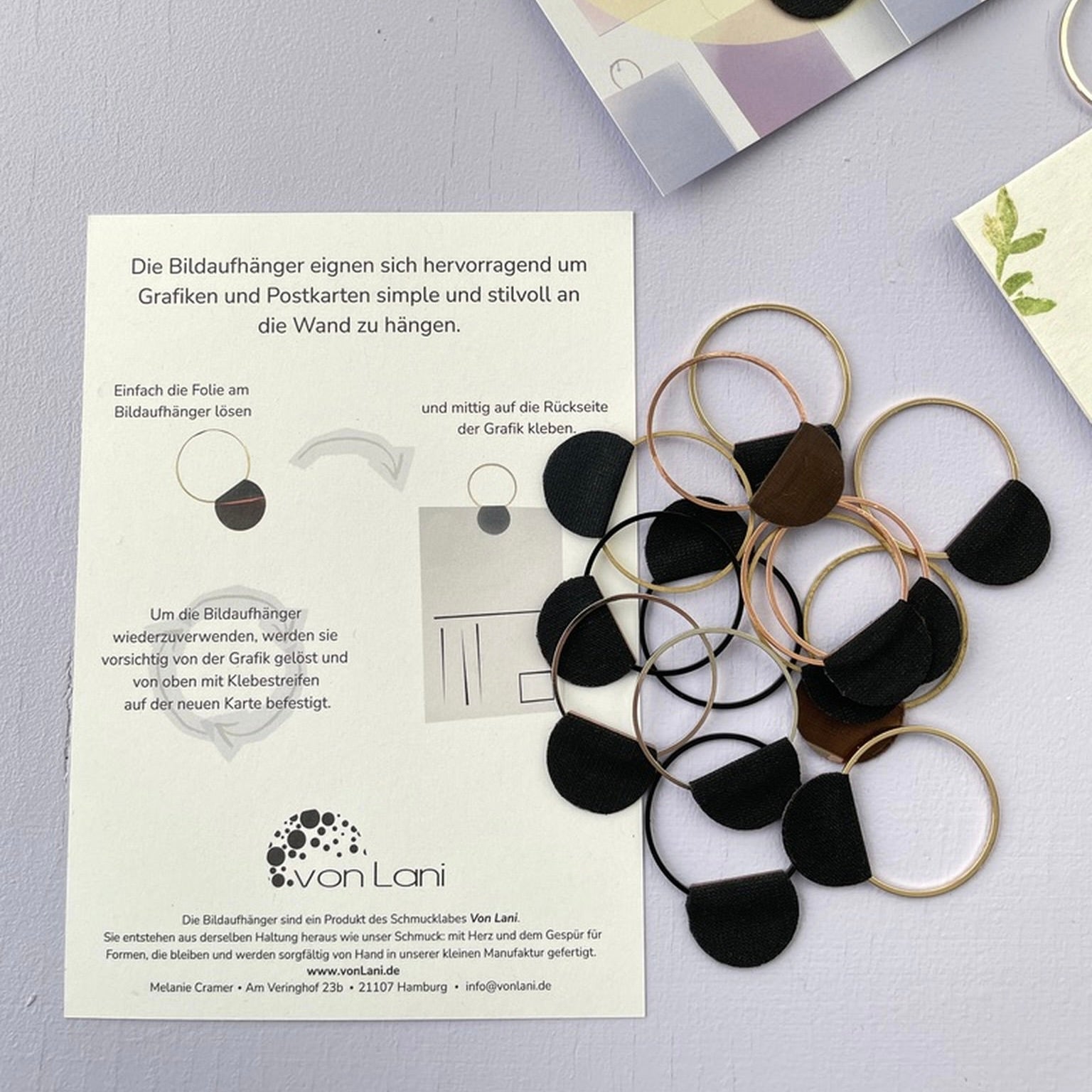 Diese schlichten Bildaufhänger mit 3 kleinen Kreisen machen es leicht, kleine Kunstwerke, Postkarten oder liebe Grüße dekorativ an der Wand zu zeigen. Ideal für alle, die Papiermomente sammeln und sichtbar machen möchten – Erinnerungen, Fundstücke vom Flohmarkt oder Kunst aus dem Lieblingsladen.