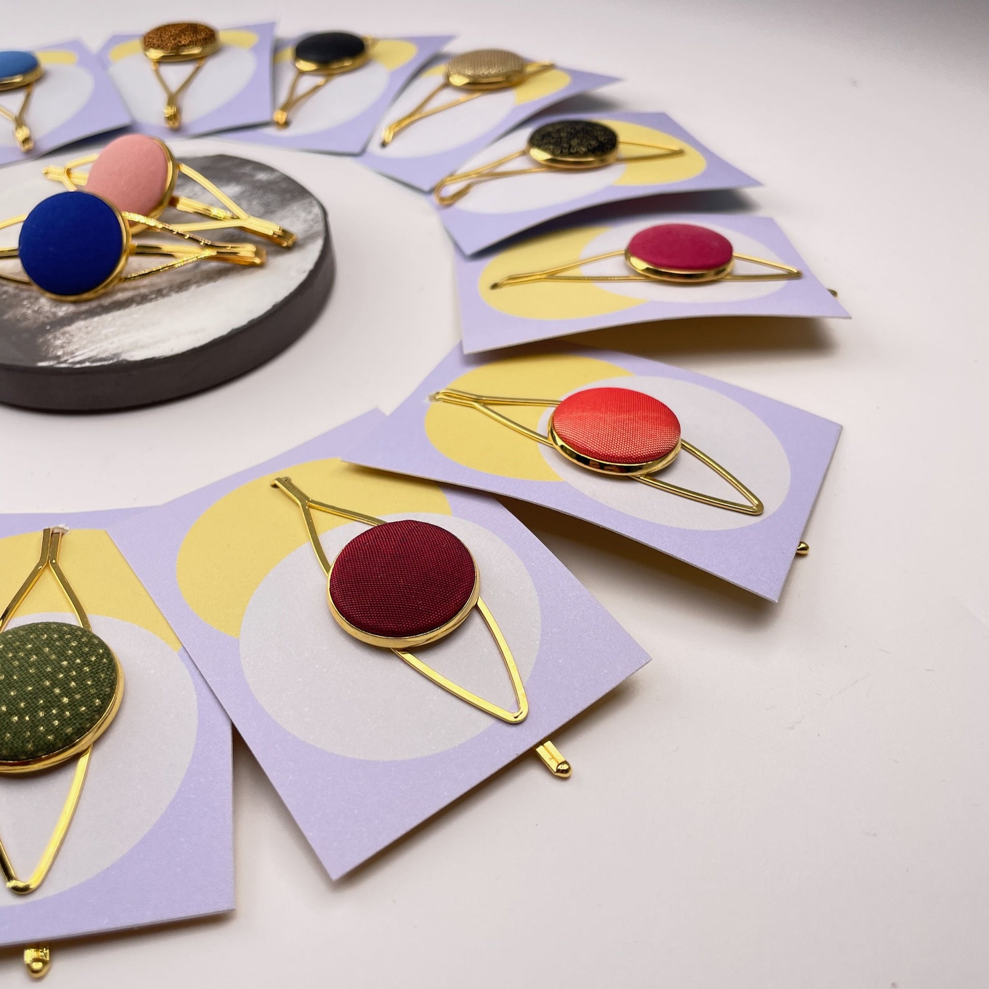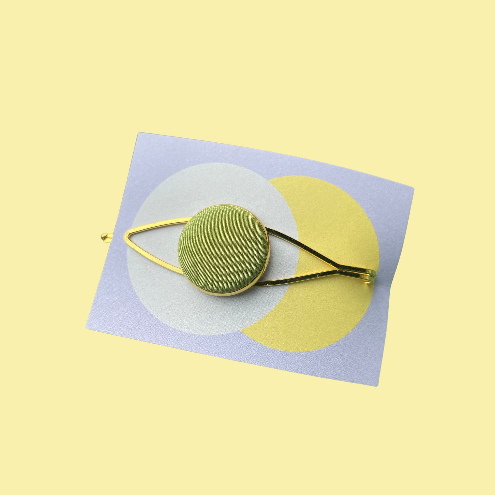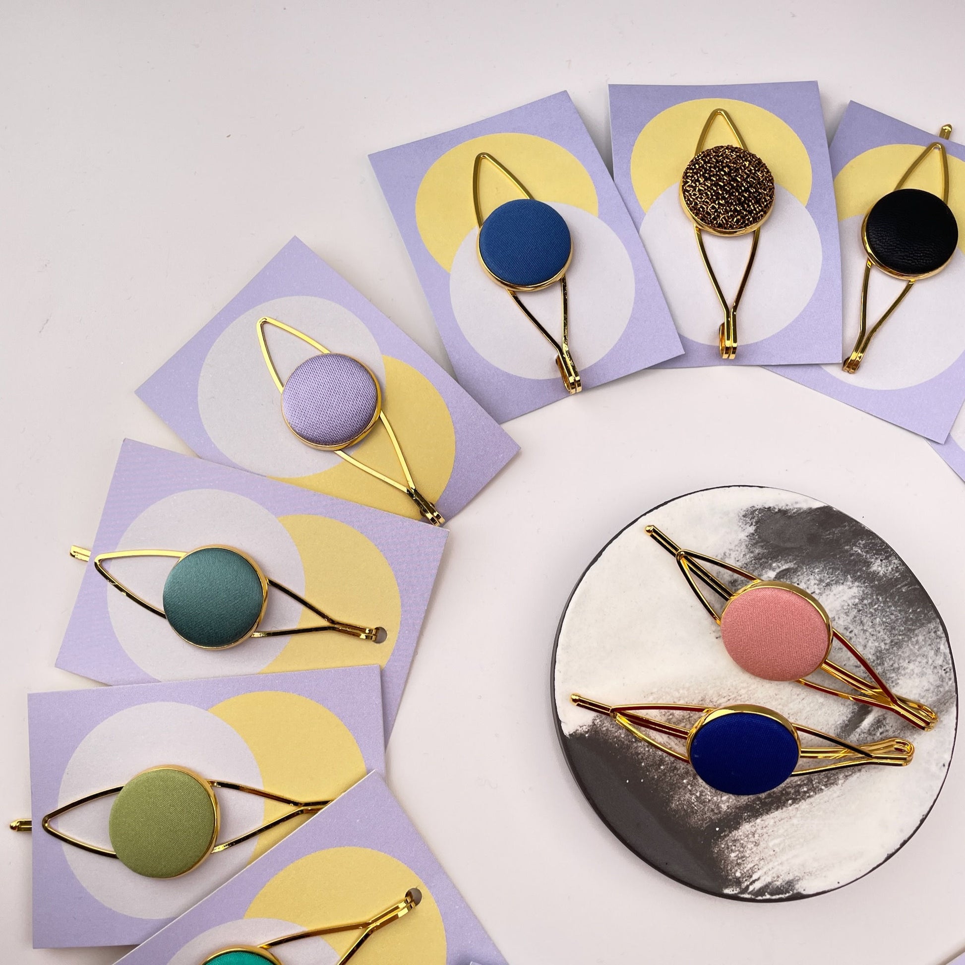 Diese goldfarbene Haarspange ist mehr als nur ein praktisches Accessoire: Ihre ovale Form erinnert an ein Auge – in der Mitte strahlt ein stoffbezogener Knopf wie eine kleine Pupille. So entsteht ein zarter Hingucker, der Eleganz mit Farbe verbindet.