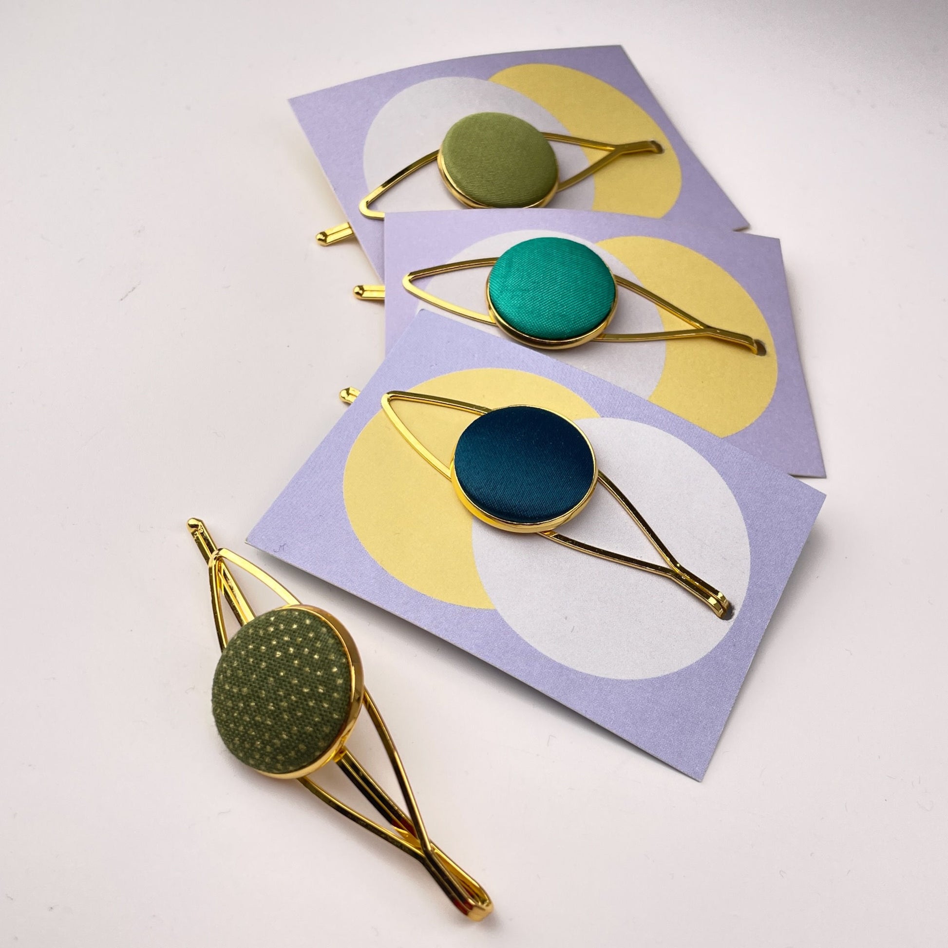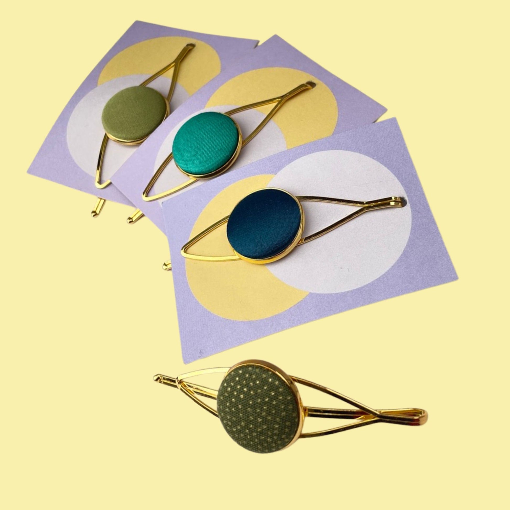 🧵 Jeder Knopf wird von mir sorgfältig mit Stoff bezogen – oft aus besonderen Fundstücken oder Vintage-Stoffen. So wird jede Spange ein kleines Unikat.