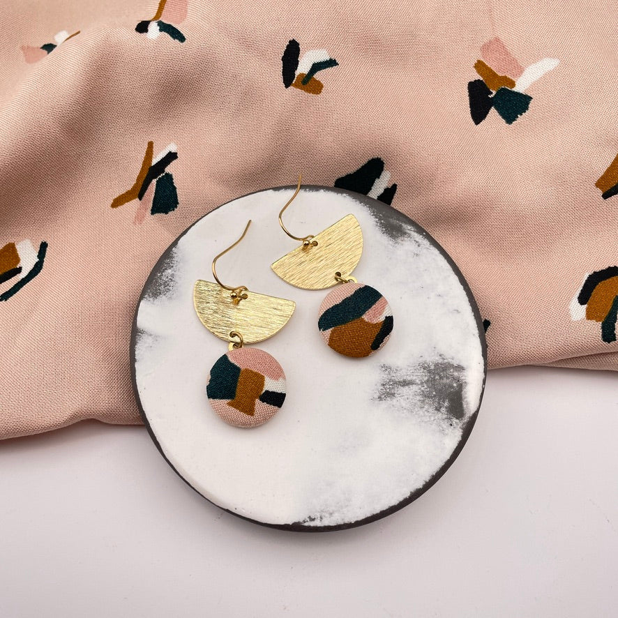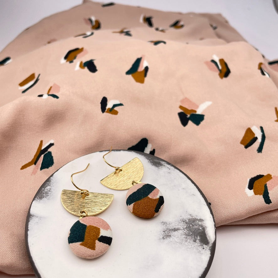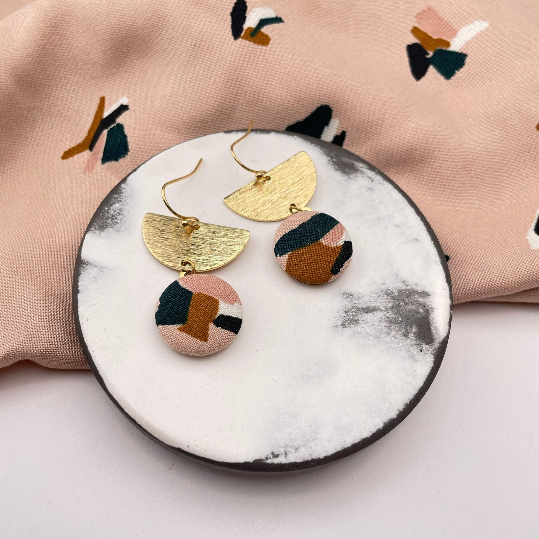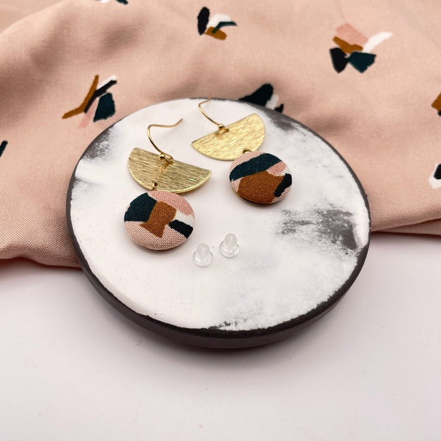 Ein formschöner Ohrring mit Präsenz, der dich strahlen lässt: Diese Ohrringe kombinieren einen fein strukturierten Halbkreis mit einem feinen Anhänger, der aus von Hand gemachten Stoffknaop besteht. Liebst du Stoffe, so ist das genau das richtige für Dich.
