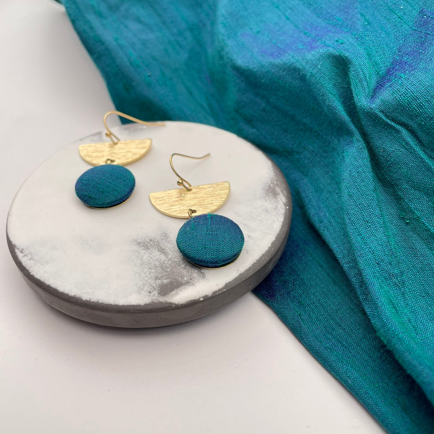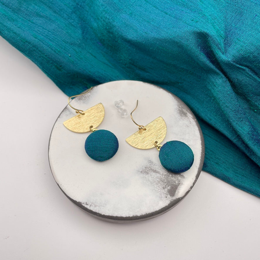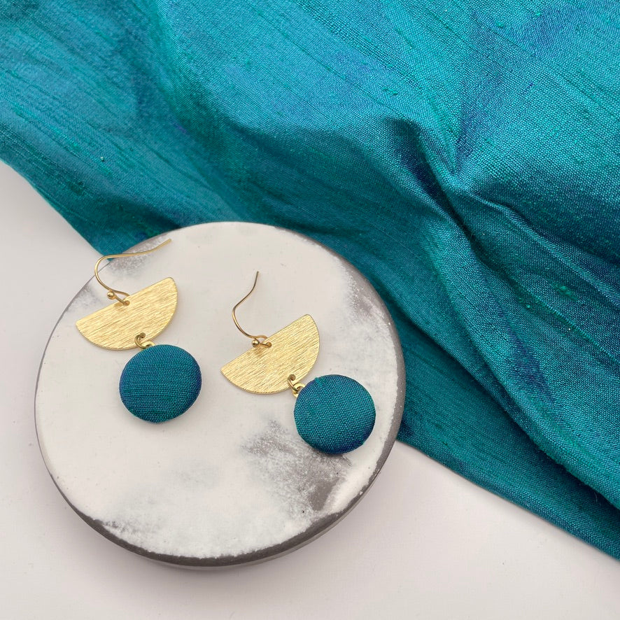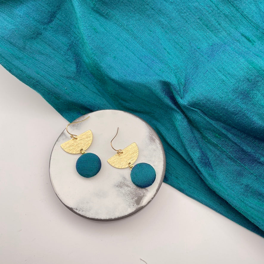 Ein formschöner Ohrring mit Präsenz, der dich strahlen lässt: Diese Ohrringe kombinieren einen fein strukturierten Halbkreis mit einem feinen Anhänger, der aus von Hand gemachten Stoffknaop besteht. Liebst du Stoffe, so ist das genau das richtige für Dich.
