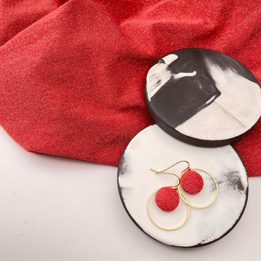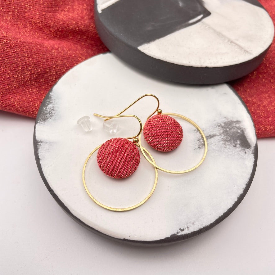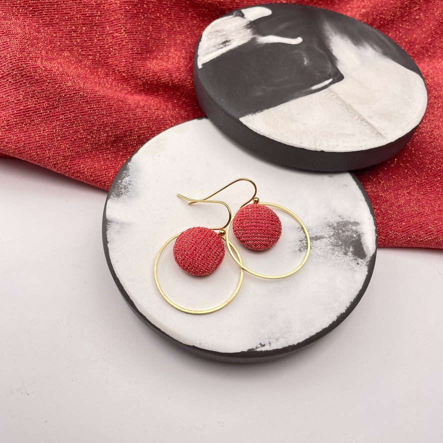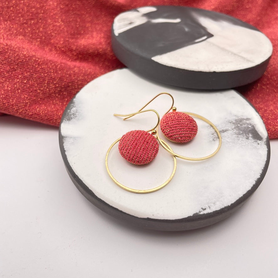 Diese Ohrringe verbinden feine Stoffstruktur mit klarer Form. Der kleine, von Hand bezogene Knopf mit ausgewählten Stoff liegt eingerahmt in einem schmalen Ring aus Messing – eine schlichte, aber besondere Komposition.