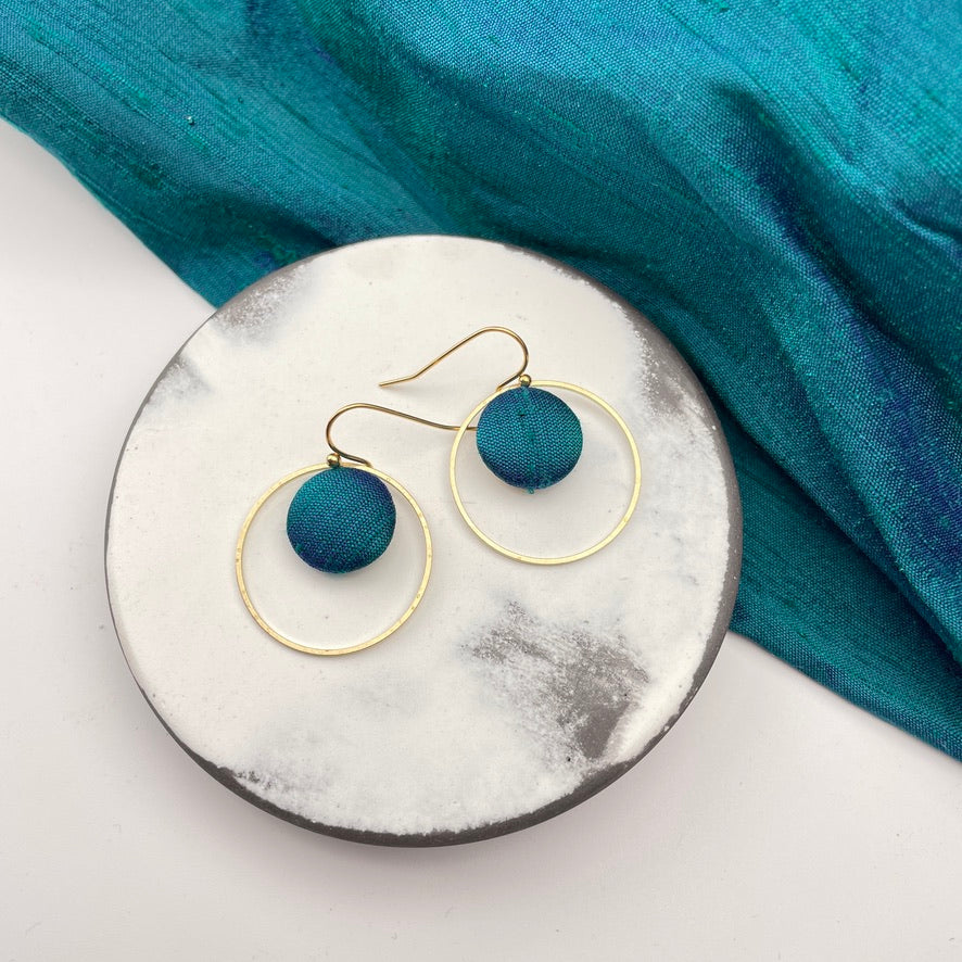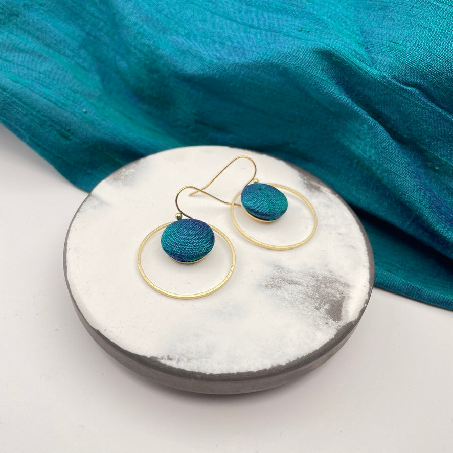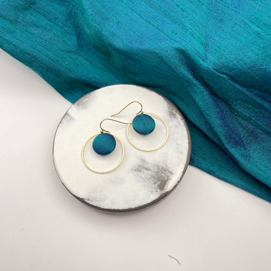 Diese Ohrringe verbinden feine Stoffstruktur mit klarer Form. Der kleine, von Hand bezogene Knopf mit ausgewählten Stoff liegt eingerahmt in einem schmalen Ring aus Messing – eine schlichte, aber besondere Komposition.