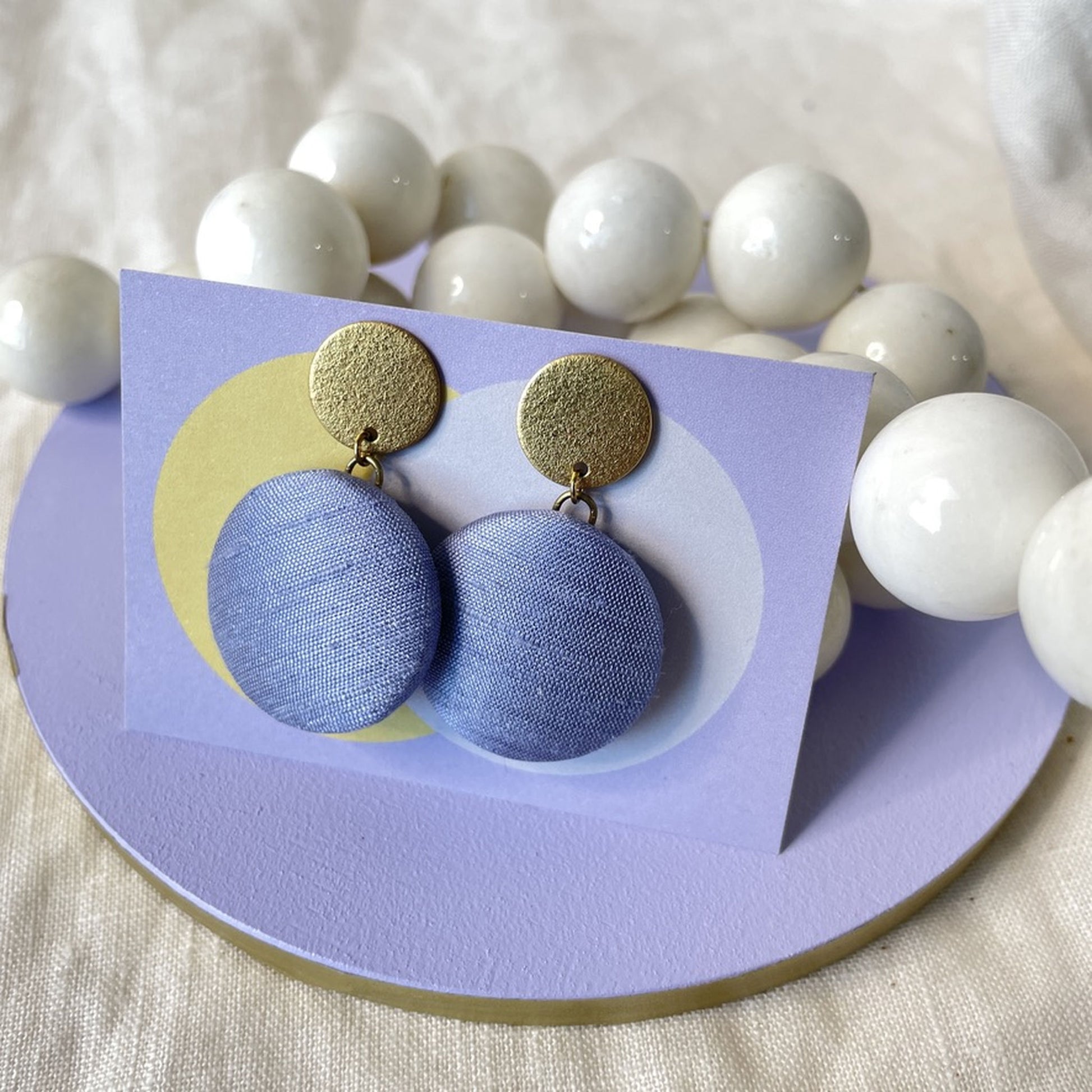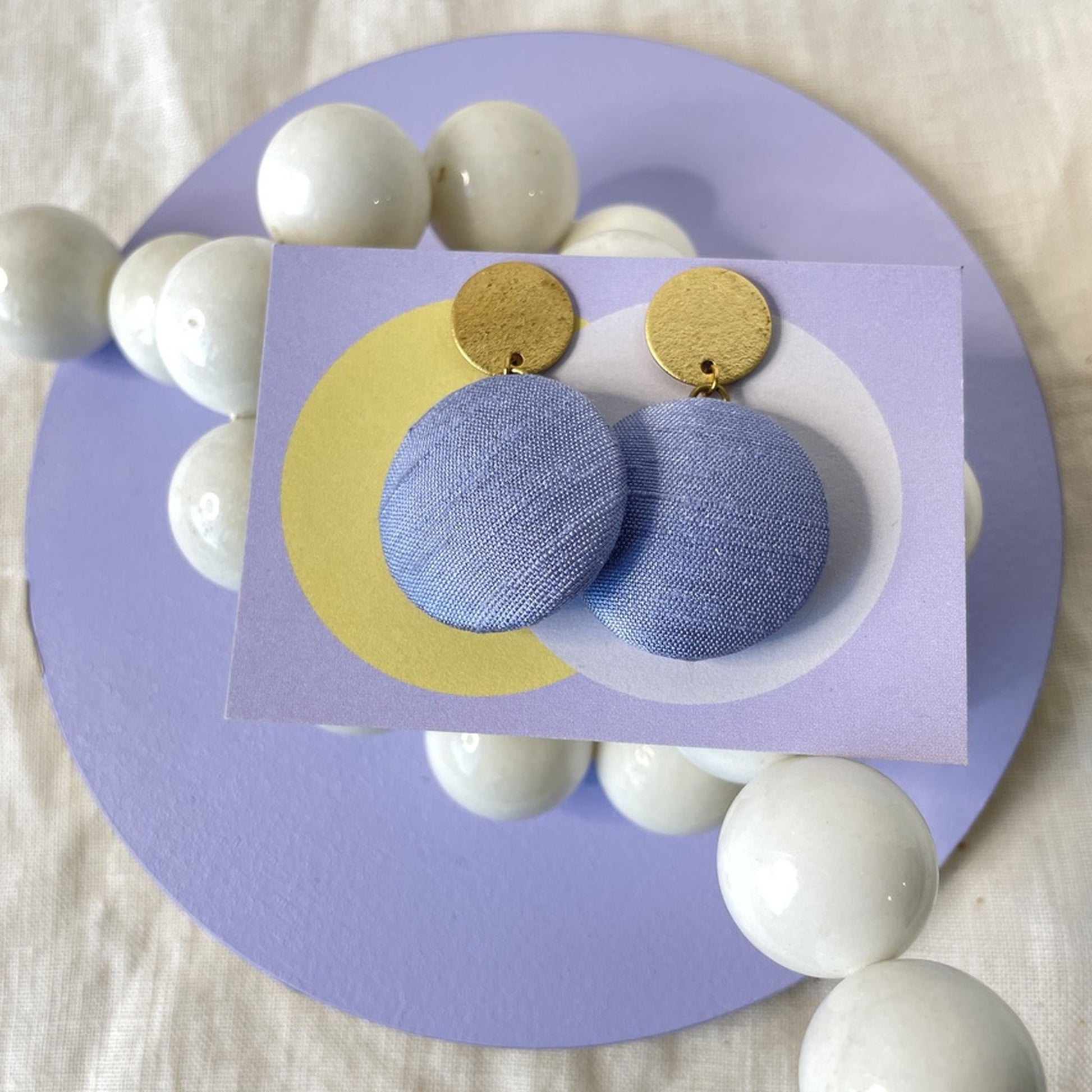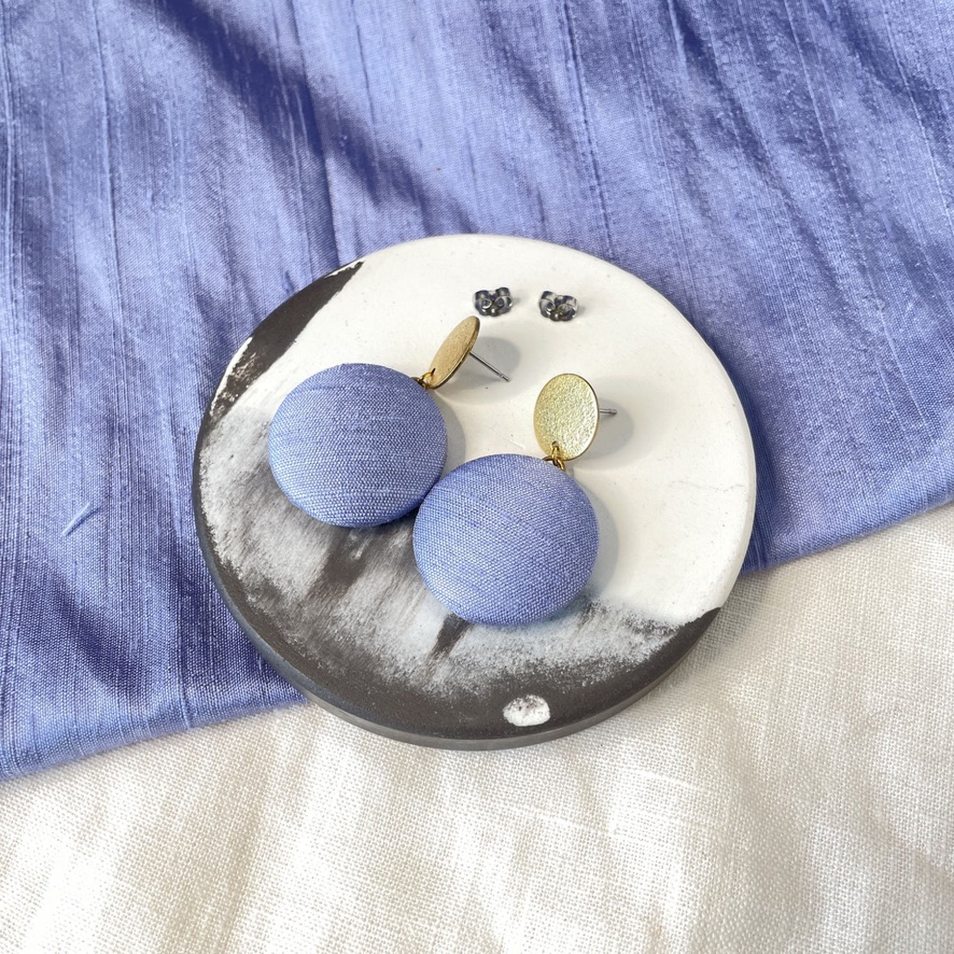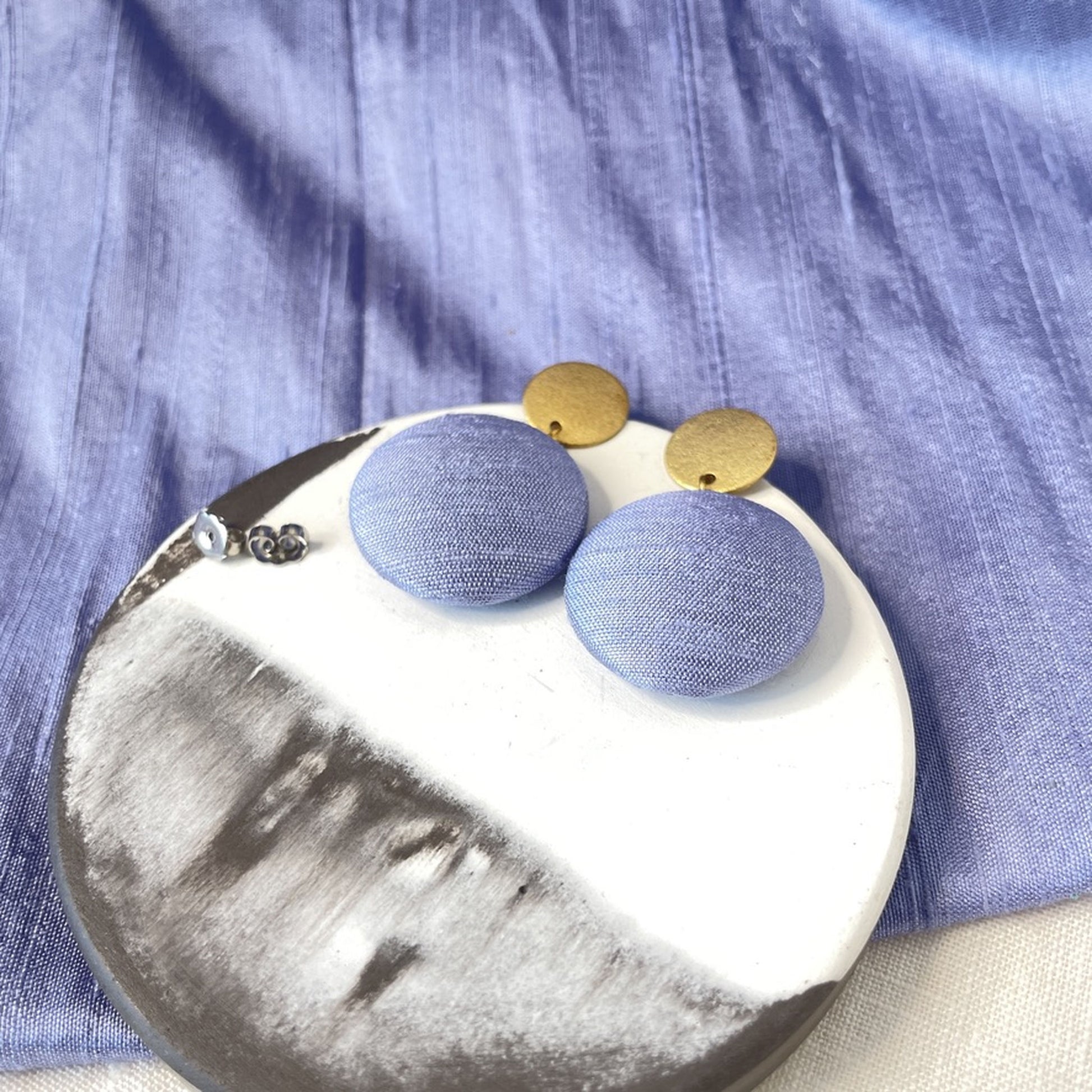 Diese Variante kombiniert einen Stoffanhänger aus zarten fliederblauen Seidenstoff mit einem strukturierten Stecker, der an feinen Sand erinnert – natürlich und sanft im Ausdruck. Eine ausdrucksstarke Komposition – für alle, die Kontraste lieben und Schmuck mit Charakter suchen.