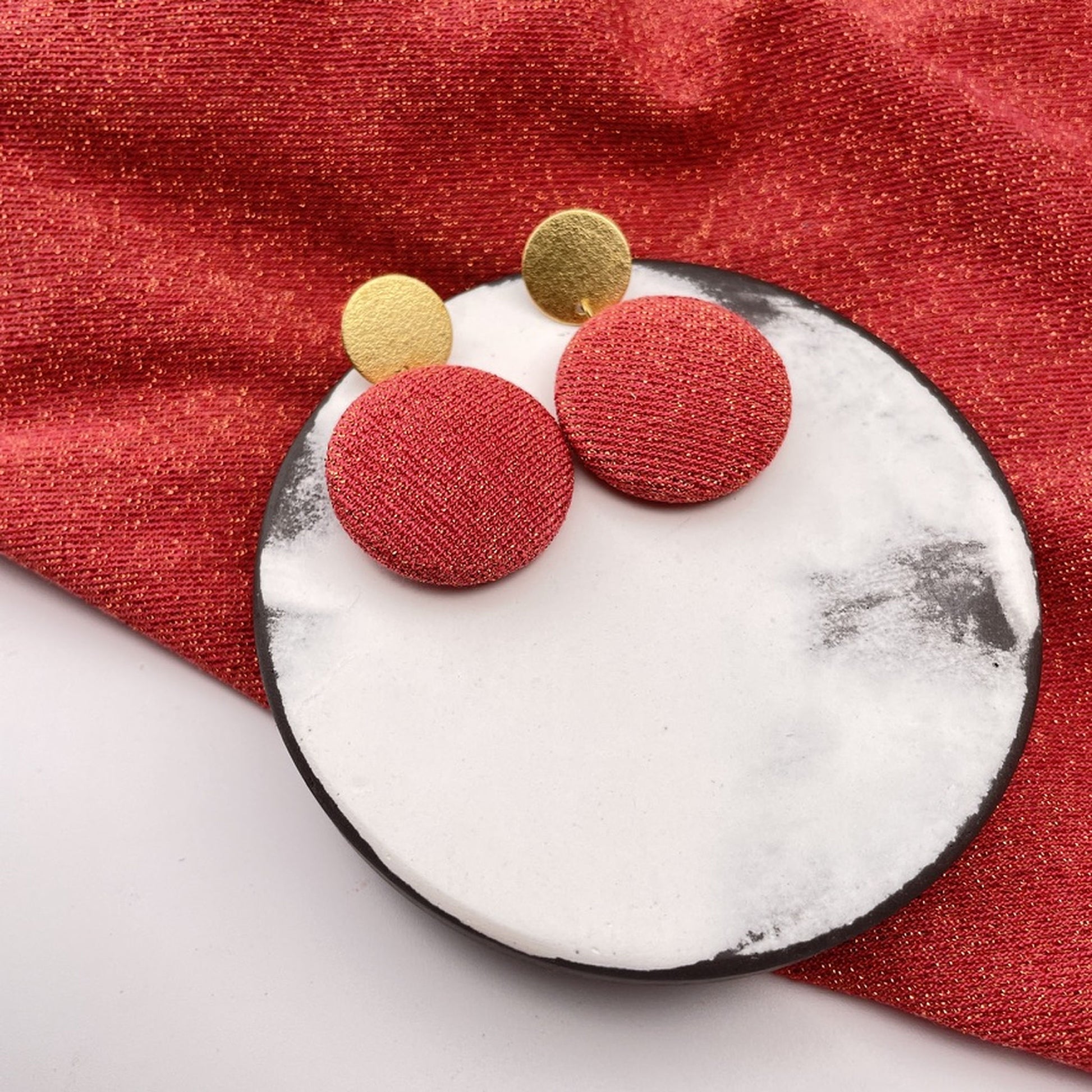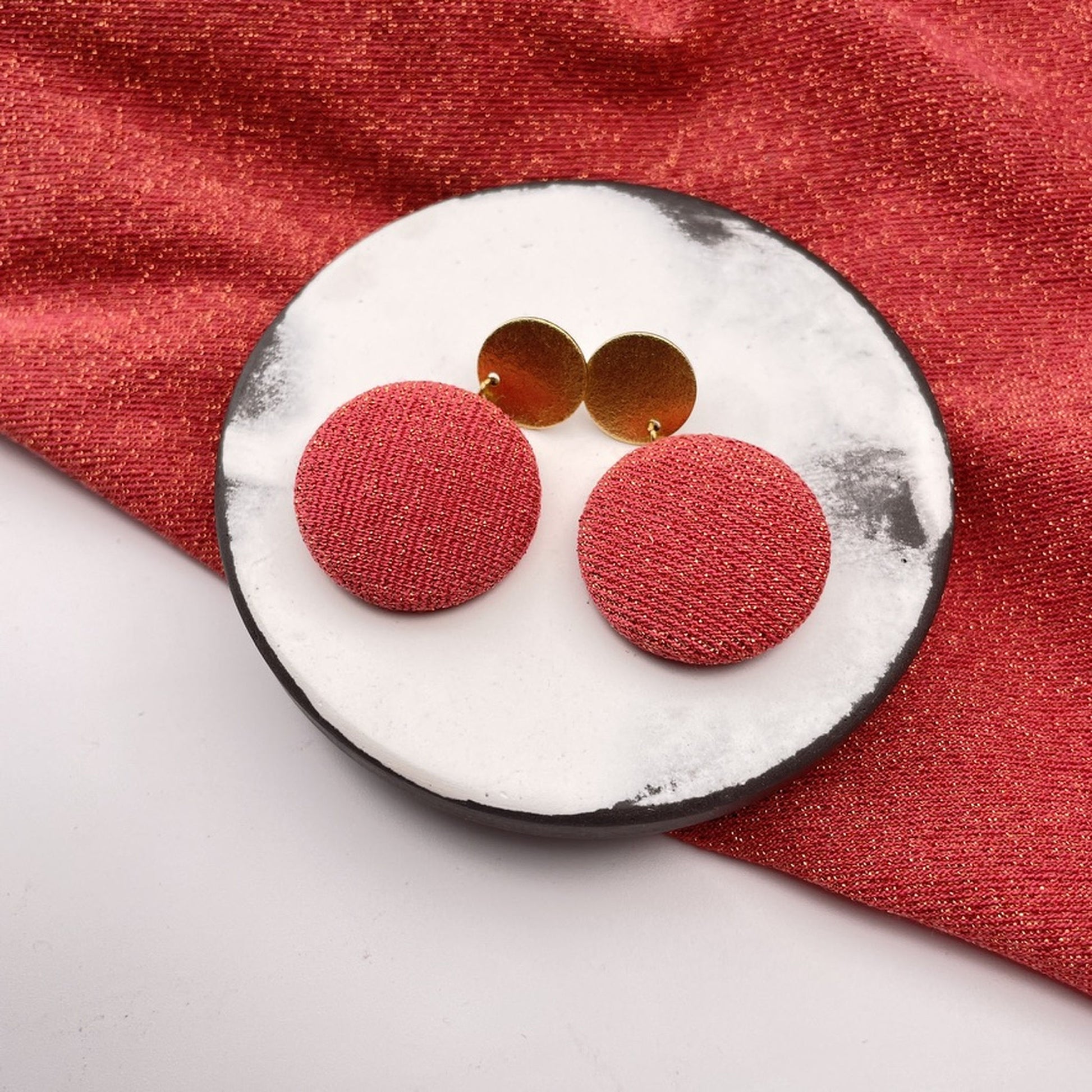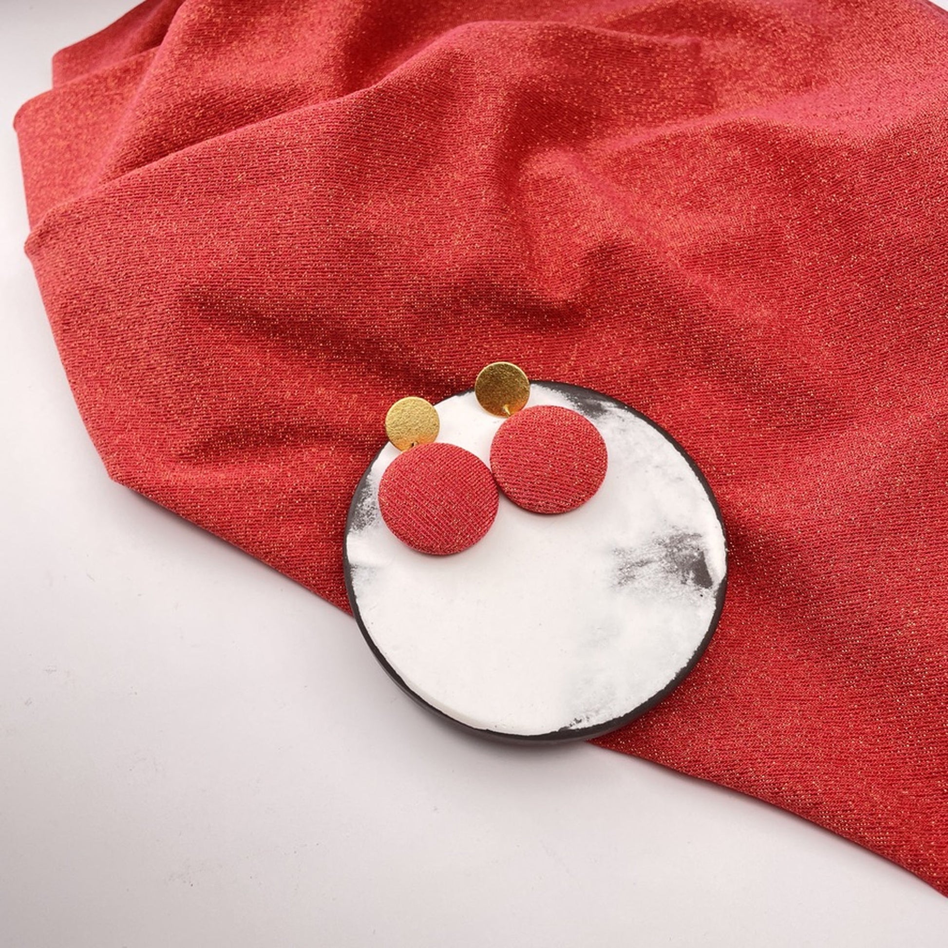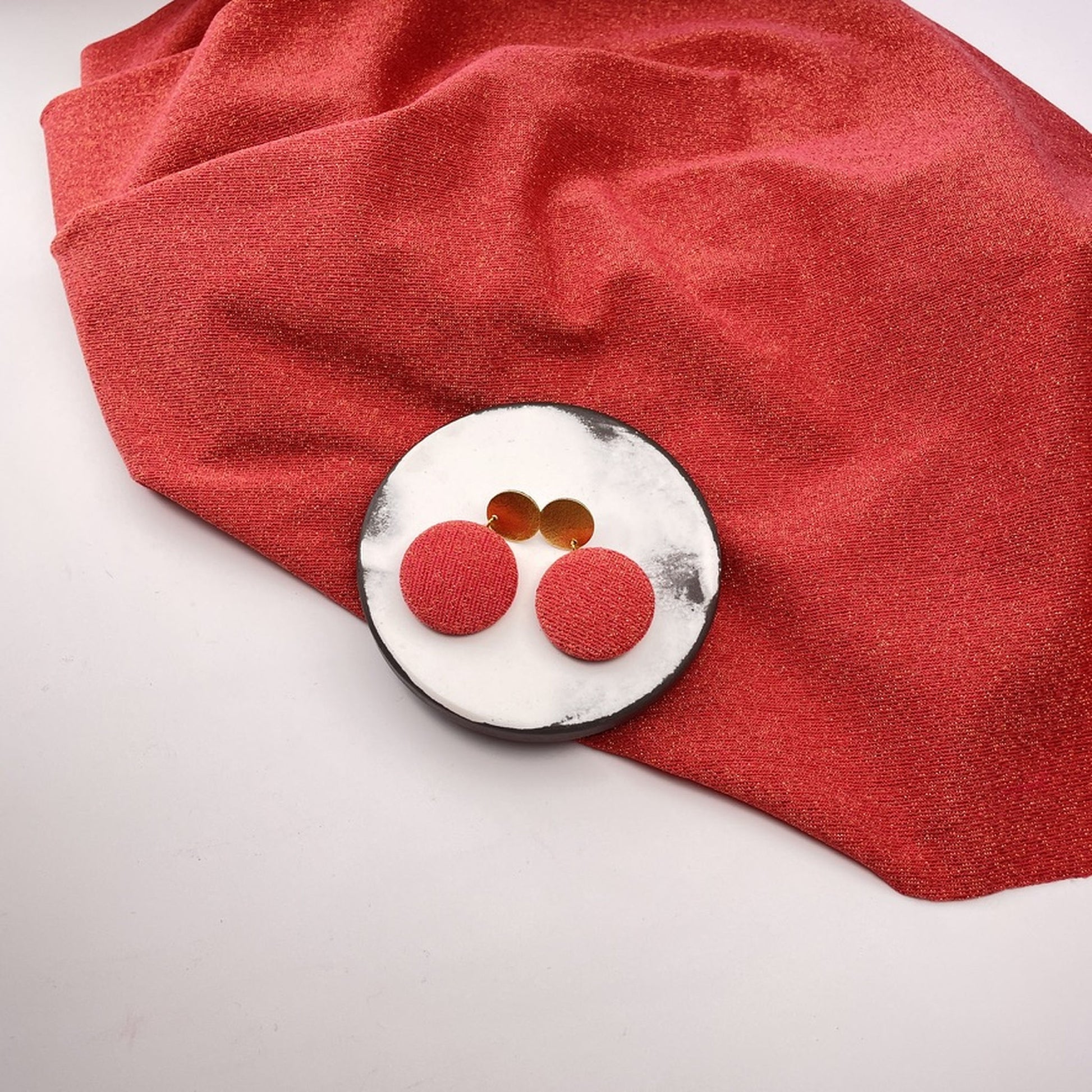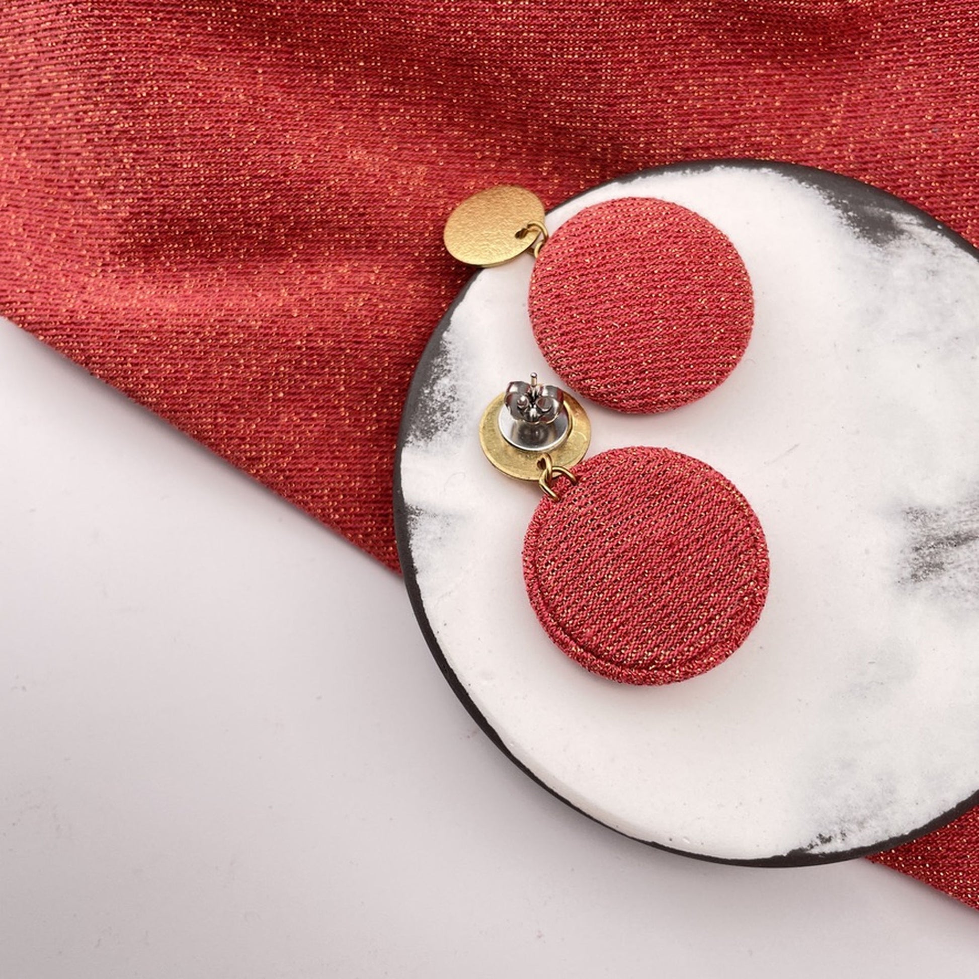 Diese Variante kombiniert einen Stoffanhänger in feinsten Glitzernden Rot mit einem strukturierten Stecker, der eine feine Mondlandschaftsstruktur trägt – lebendig und zart zugleich. Eine ausdrucksstarke Komposition – für alle, die Kontraste lieben und Schmuck mit Charakter suchen.