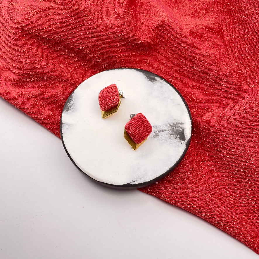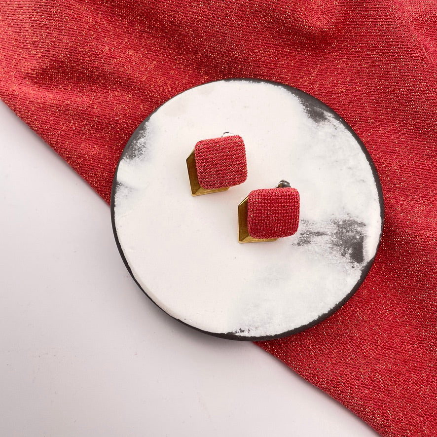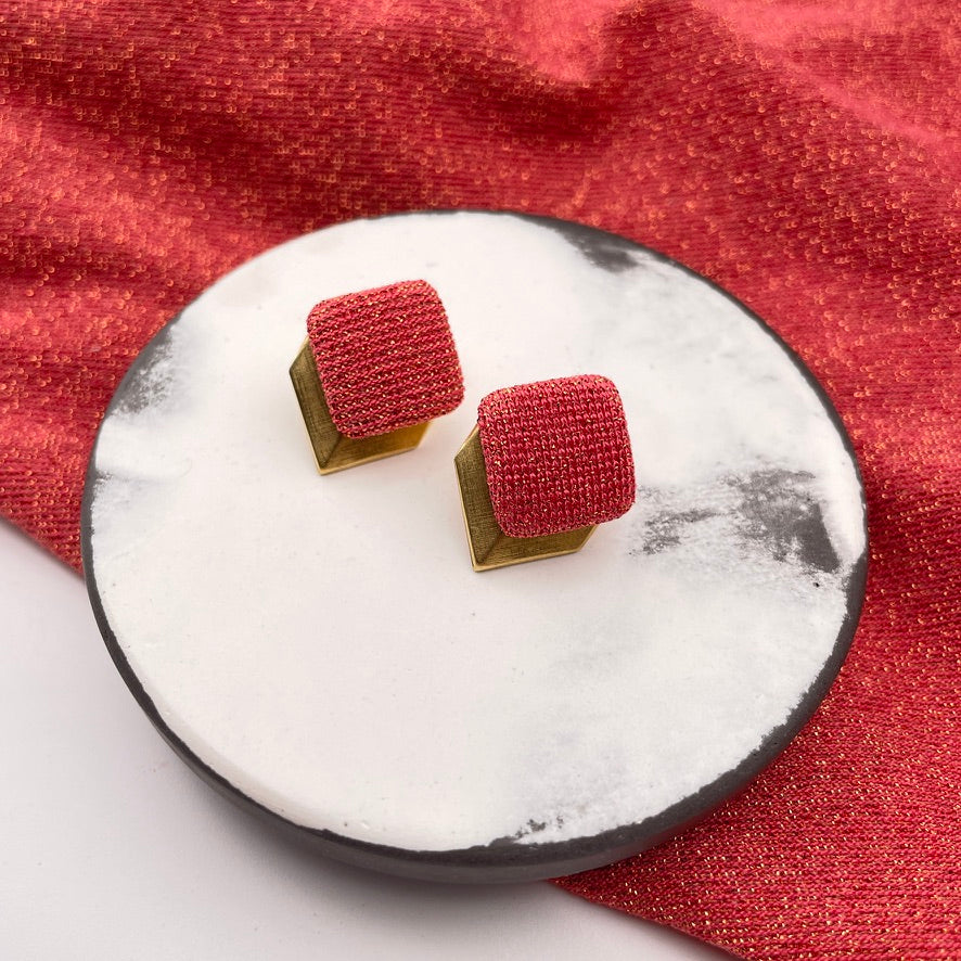 Die Ohrstecker bestehen auf einen 1,5cm kleinen quadradtischen von Hand bespannten Knopf auf einen starken Messingelement aus reinem Messing. Ganz grafisch trägt sich dieser Würfel an deinem Ohr. Das Modell wirkt klar und ausagekräftig zugleich – und ist ideal für alle, die Statementschmuck lieben, bloß nicht langweilig.