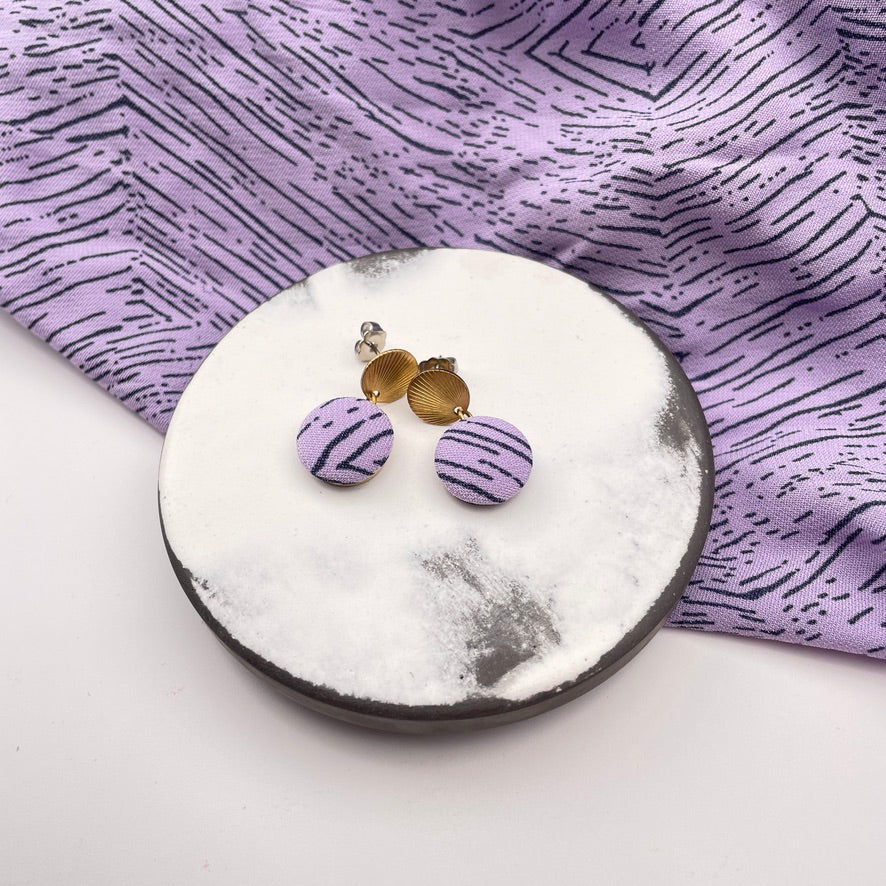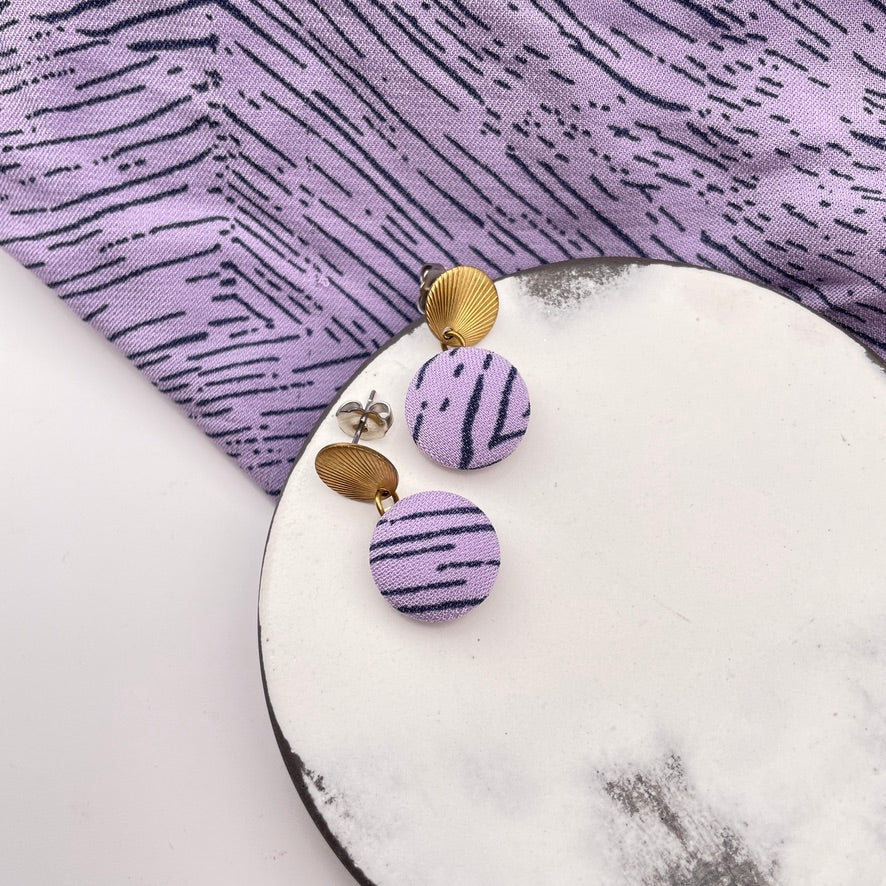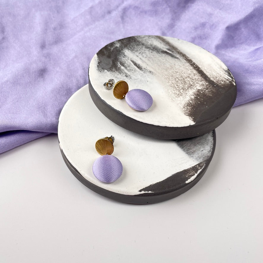 Der zarte Ohrstecker zeigt ein feines Relief, das an Sonnenstrahlen oder Muschelstrukturen erinnert. Daran hängt ein 1,5 cm kleiner Stoffknopf aus goldgelbem Leinenmix. Das Modell wirkt minimalistisch und verspielt zugleich – und ist ideal für alle, die es schlicht mögen, aber nicht langweilig.