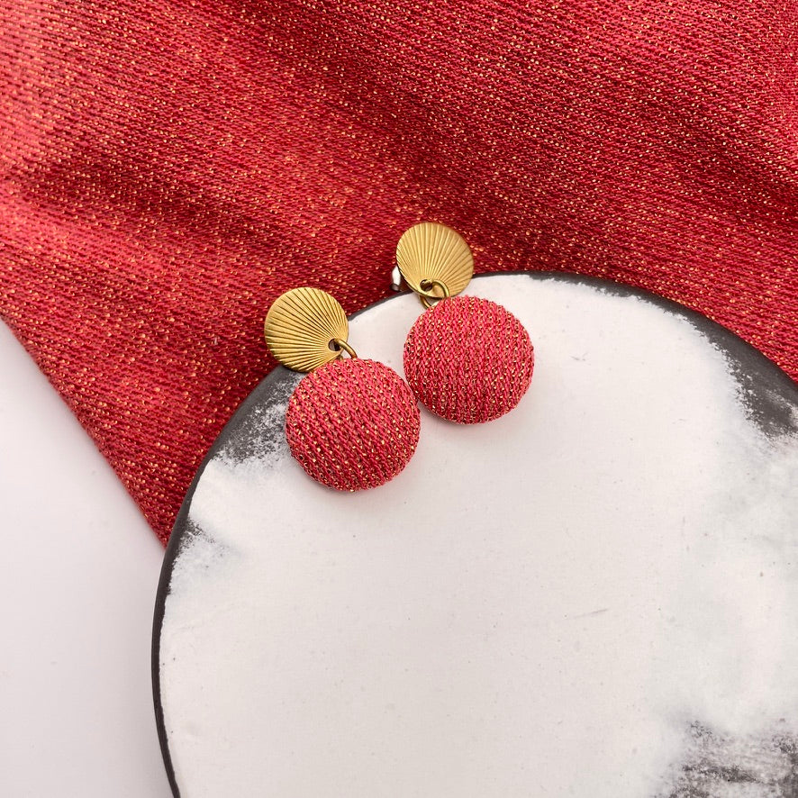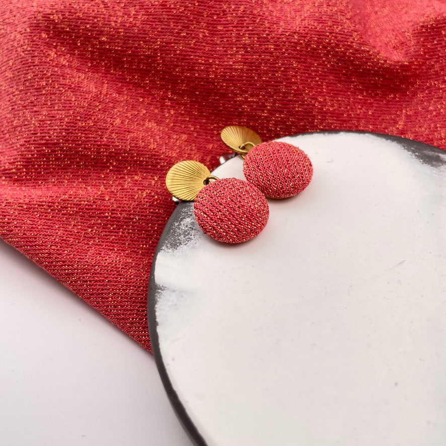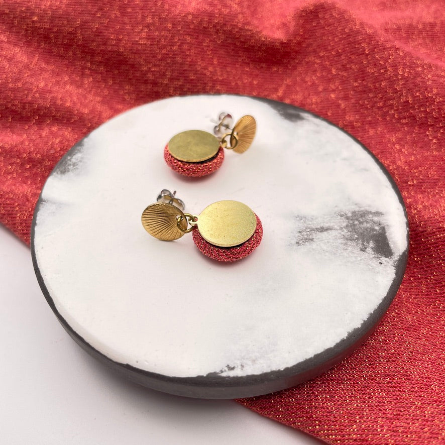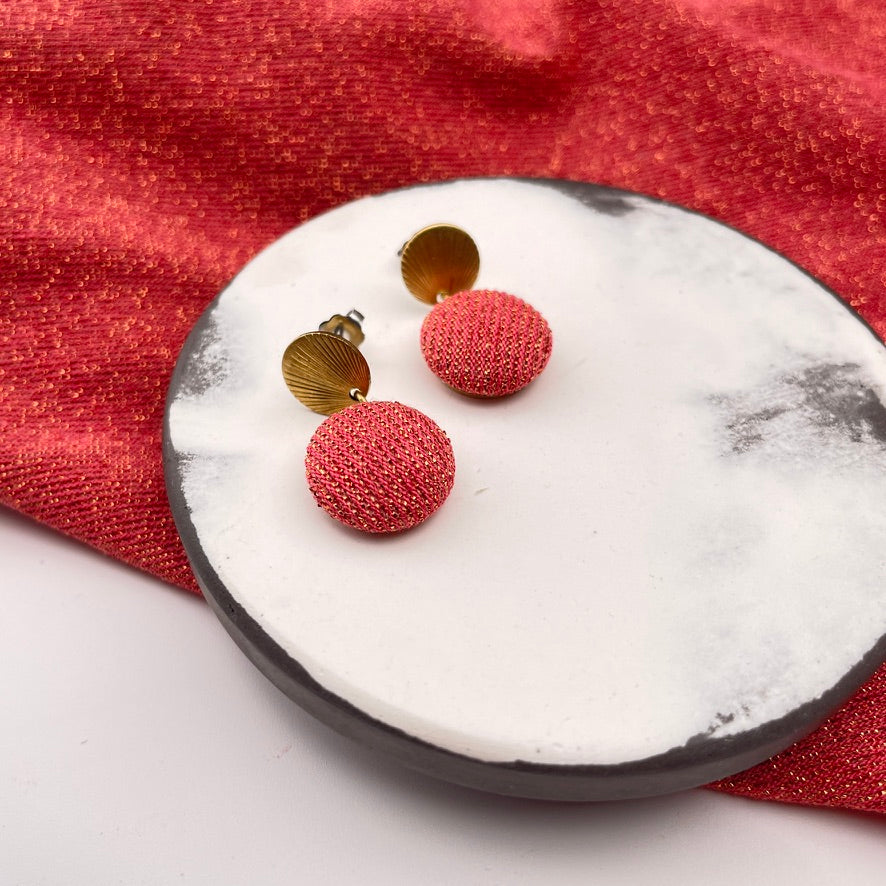 Der zarte Ohrstecker zeigt ein feines Relief, das an Sonnenstrahlen oder Muschelstrukturen erinnert. Daran hängt ein 1,5 cm kleiner Stoffknopf aus goldgelbem Leinenmix. Das Modell wirkt minimalistisch und verspielt zugleich – und ist ideal für alle, die es schlicht mögen, aber nicht langweilig.
