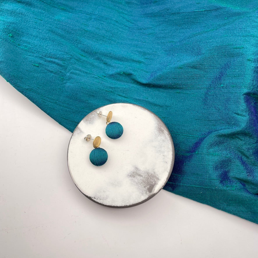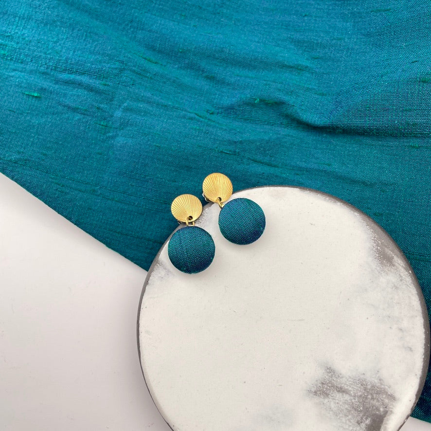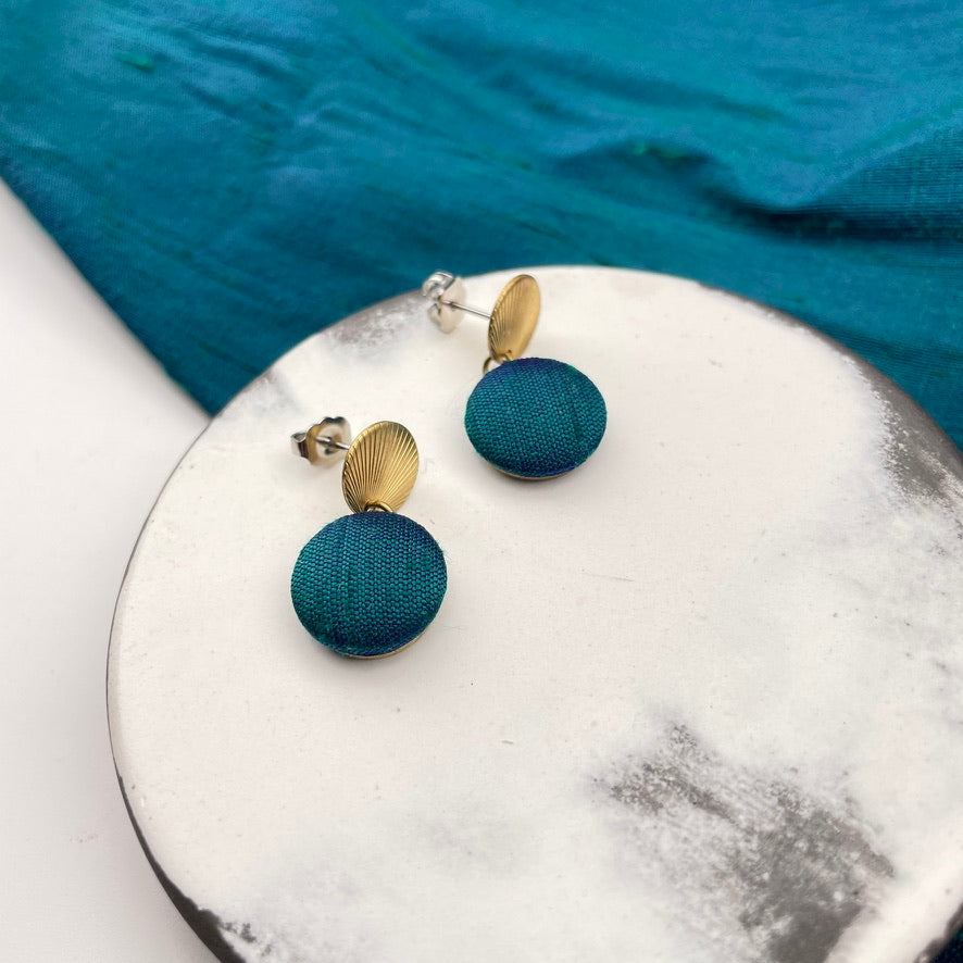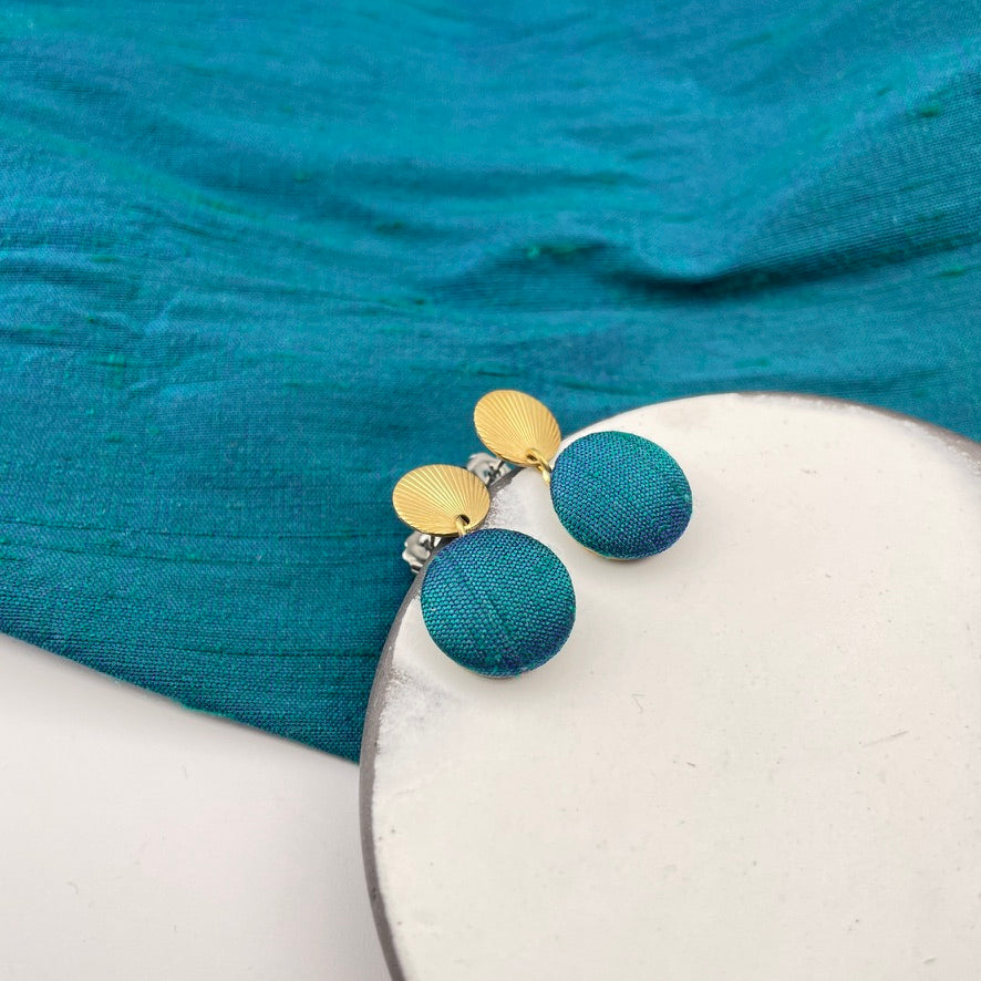 Der zarte Ohrstecker zeigt ein feines Relief, das an Sonnenstrahlen oder Muschelstrukturen erinnert. Daran hängt ein 1,5 cm kleiner Stoffknopf aus goldgelbem Leinenmix. Das Modell wirkt minimalistisch und verspielt zugleich – und ist ideal für alle, die es schlicht mögen, aber nicht langweilig.