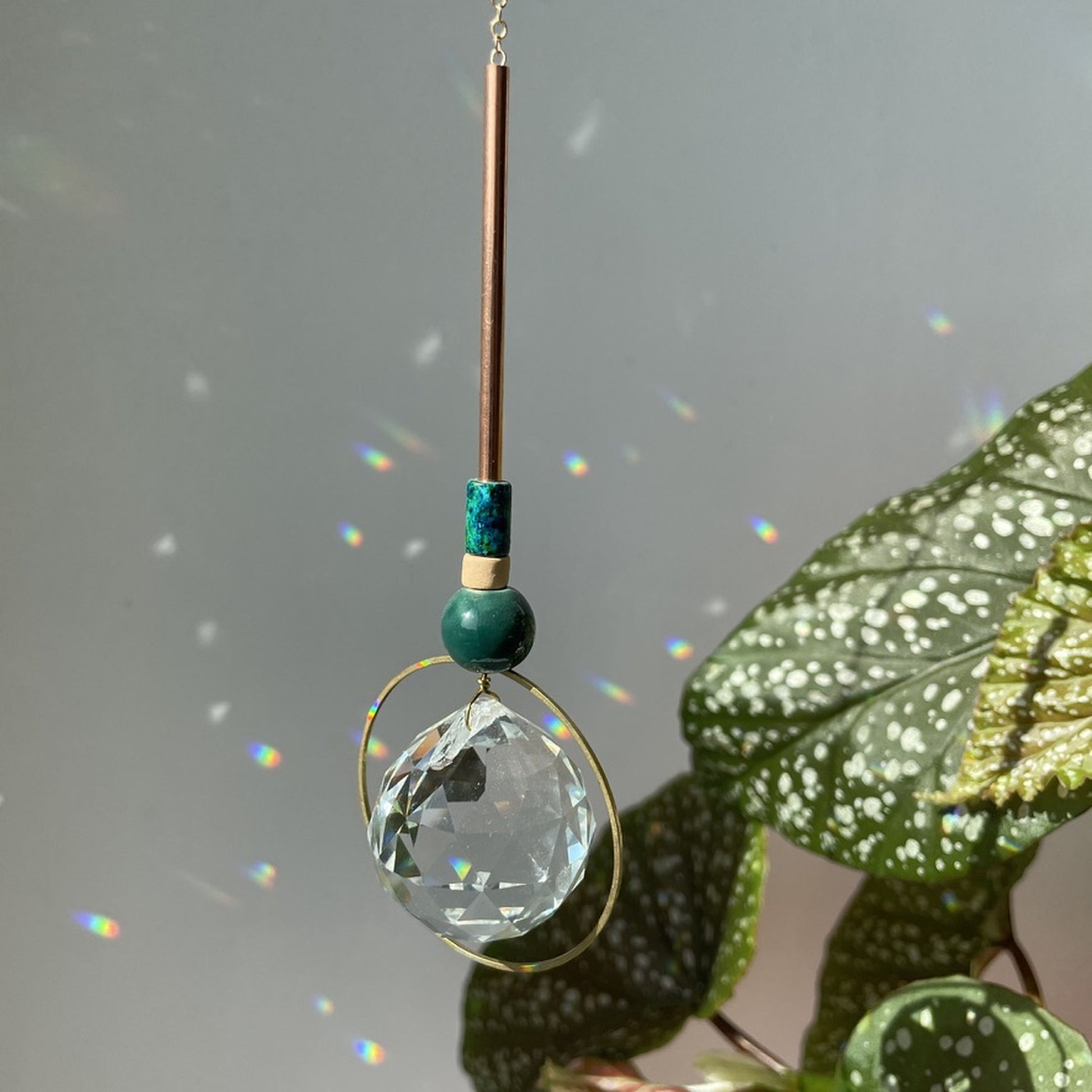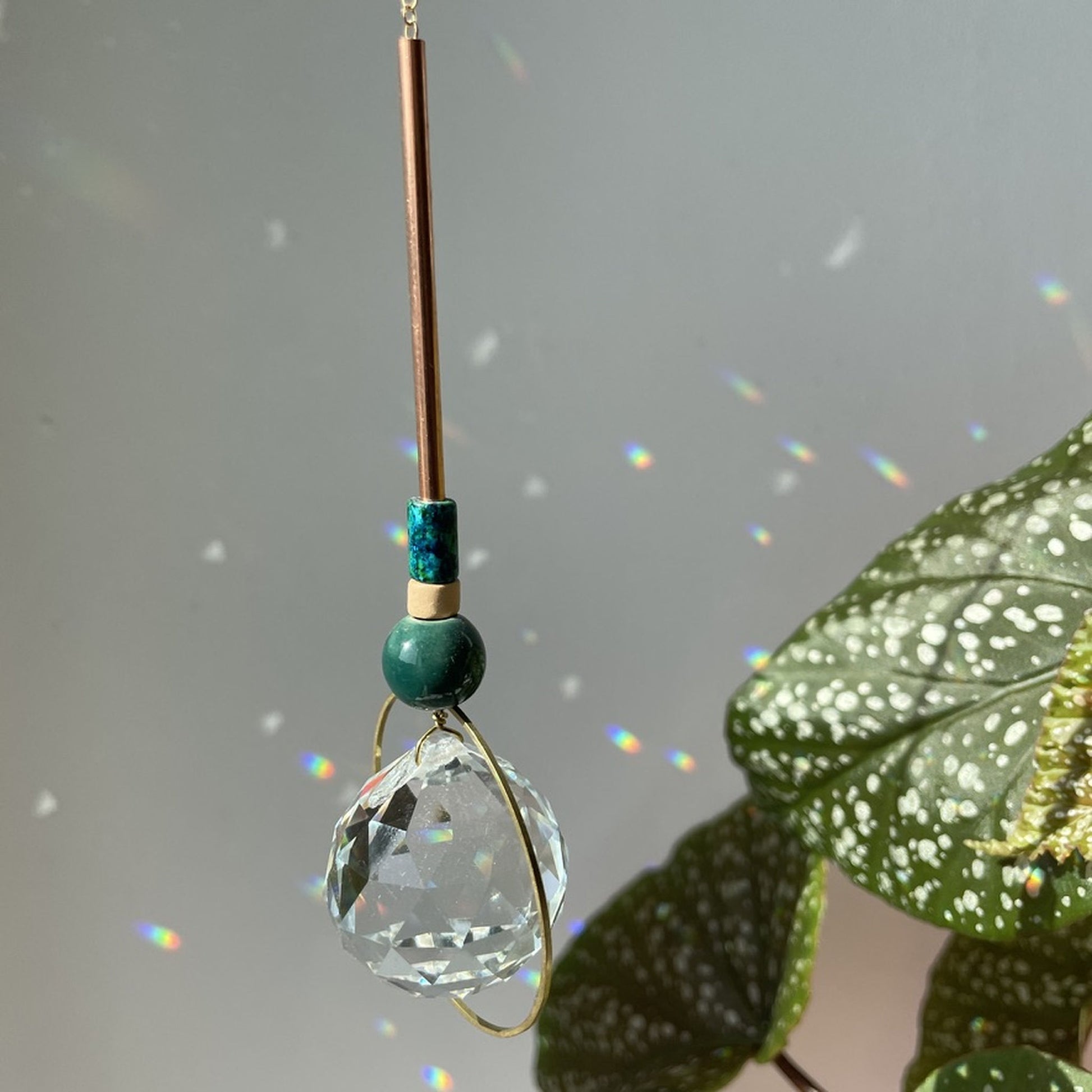 Das funkelnde Prisma wird von einer zarten Messingkette gehalten, die mit einem Haken ganz unkompliziert befestigt werden kann – ob am Fenster, im Kinderzimmer oder im Garten. Auch ohne Sonne bleibt der Lichtfänger ein stilvoller Blickfang.