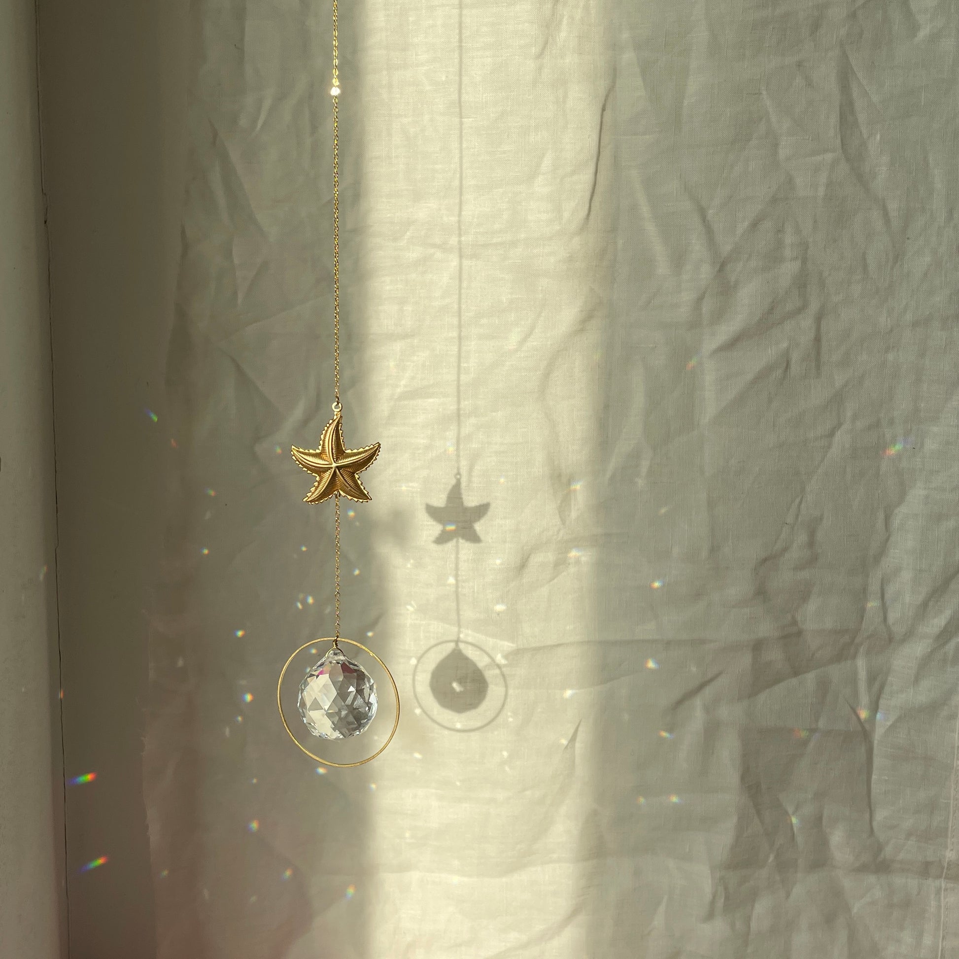 Jeder Lichtfänger ist mit einer goldfarbenen Messingkette gefertigt und trägt als schmückendes Symbol eine Seestern – Der Seestern symbolisiert oft Heilung, Regeneration und Erneuerung, da er verlorene Gliedmaßen nachwachsen lassen kann. Gleichzeitig steht er für Schutz, Orientierung und spirituelle Führung, besonders in Verbindung mit dem Meer. Das funkelnde Kristall ist in einen zarten Ring gefasst und bleibt auch an grauen Tagen ein stilvoller Hingucker – am Fenster, auf dem Balkon oder im Garten.